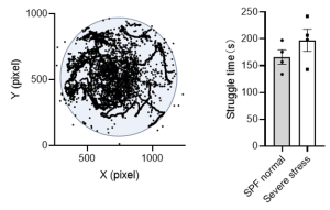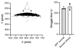 案例讲解:CUMS模型小鼠在旷场强迫游泳实验和悬尾实验中,行为学数据的精准采集和对比分析,发现:Severe stress 小鼠的挣扎时间比SPF normal小鼠略微增加,精准识别Severe stress小鼠有焦虑应激行为,但没有到抑郁的严重程度。